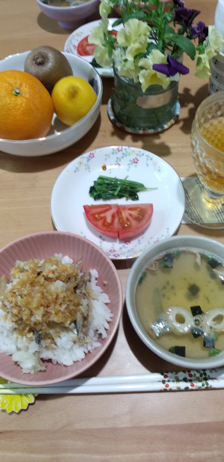 骨まで食べられる鯵の干物を焼いてほぐして大根おろしのせた夕飯です。