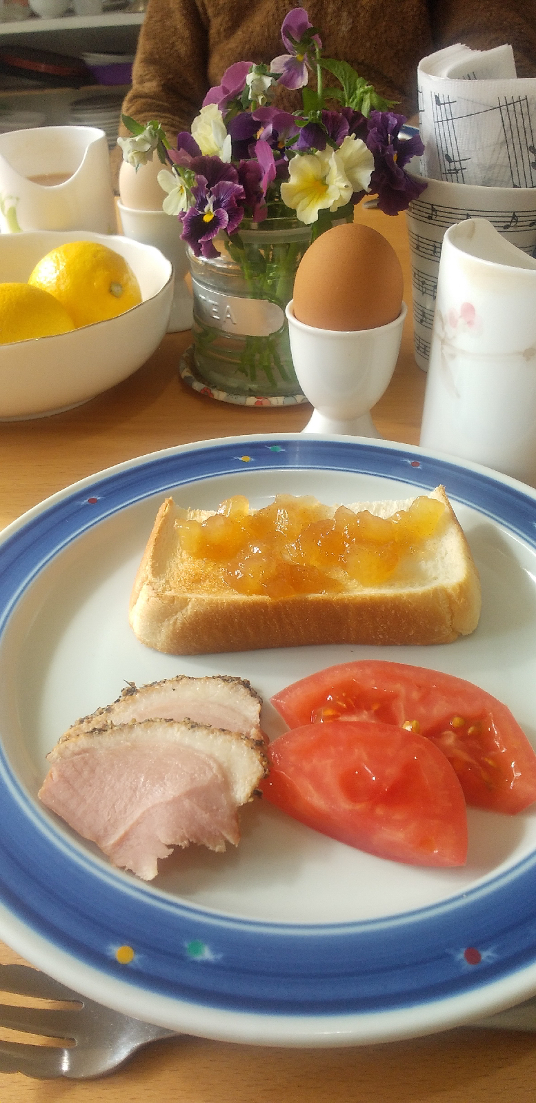 今朝はジャムトーストと茹で卵と鴨のロースト🍅トマトです