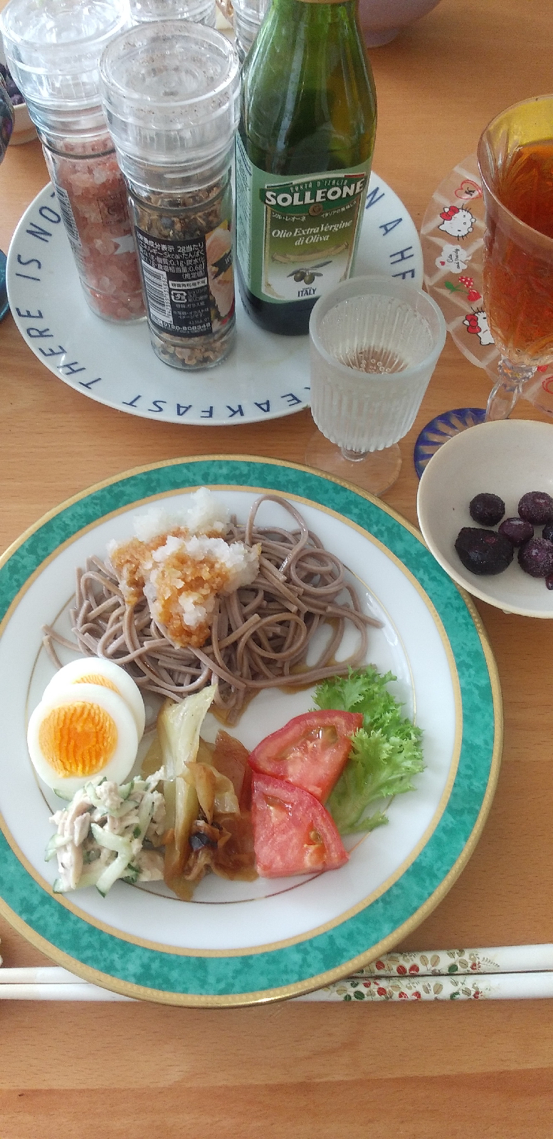 今朝はお蕎麦25g程度に大根おろしをのせて。。。野菜や茹でたまごやね。。。